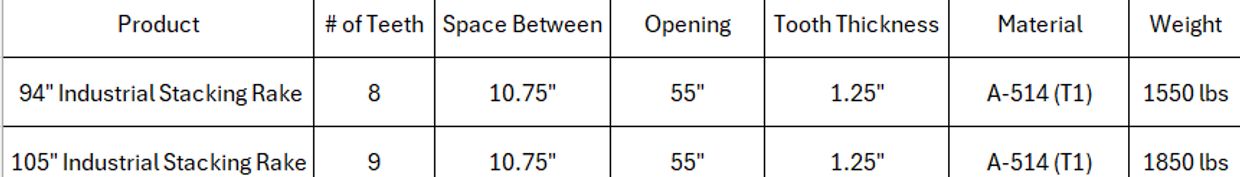 Industrial stacking rakes are designed to work great with backhoes and articulated loaders. Using high grade T1 steel, they are very durable attachments. Long curved teeth, and large gussets make gathering and piling debris easy and efficient.